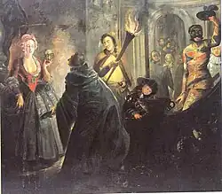 Eines der wenigen erhaltenen Objekte aus der ursprünglichen Inneneinrichtung des Herrenhauses ist das um 1750 entstandene Wandgemälde. Es zeigt eine Maskenballszene in höfischem Ambiente. Heute befindet es sich in der Bibliothek des Torhaus-Museums.[11] Wilhelm Melhop schreibt zu diesem Bild: Ein noch vorhandenes großes Bild zeigt angeblich, wie der Zar Peter III. auf der Maskerade seiner Mätresse denjenigen Höfling vorstellt, den sie auf sein Geheiß zum Gemahl nehmen müsste; ihr Gesicht ist darüber (bei der Demaskierung) offenbar sehr wenig erfreut.[1]