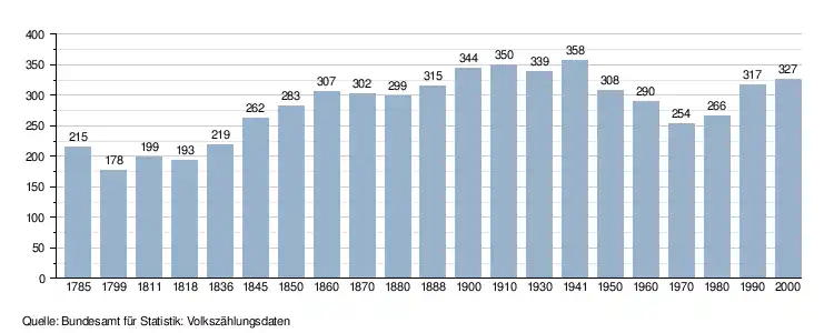 - ↑ Daten der Eidgenössischen Volkszählungen ab 1850 nach Gemeinden. (XLSX; 10 MB) Bundesamt für Statistik, Neuchâtel, 12. Juli 2024, abgerufen am 20. Juni 2025 (Öffnung in Excel nur über "Anhang/Excel-Datensatz" möglich).
