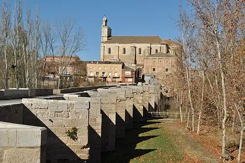 - Die 25-bogige und insgesamt gut 150 m lange Steinbrücke über den Río Pisuerga ist das bedeutendste Bauwerk der ehemaligen Stadt. Sie sowie ihre hölzernen Vorgänger ermöglichten Mensch und Tier die schwierige, weil durch sumpfiges Ufergelände führende Flussüberquerung. Die Brücke wurde in den folgenden Jahrhunderten mehrfach ausgebessert.[7]