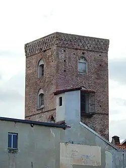 Der 24 Meter hohe Turm besteht aus Backsteinmauerwerk. Die Spitzbogenfenster der beiden oberen Geschosse charakterisieren diese als gotisch. Der obere Abschluss ist mit dekorativen Reihen von Backsteinmustern verziert.