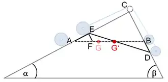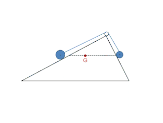 - Geometrische Folgerung: Durch die Versetzung verschiebt sich offenbar auch der Schwerpunkt G. Er muss aber auf der Horizontalen an der Stelle G‘ bleiben. Denn der Schwerpunkt wird als für diesen Zweikörper-Fall definiert. Hier nutzt Torricelli die Ähnlichkeit der Dreiecke, um die gleichen Momenten-Anteile zu Punkt G‘ zu belegen. Es gilt offenbar