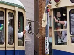 Der Fuhrpark besteht (Stand Juni 2024) aus insgesamt 62 Fahrzeugen. Davon sind lediglich vier Stück Niederflurwagen. Ihr Anteil am Gesamtfuhrpark ist mit 6,5 % unter allen nicht auf Hochbahnsteige setzenden japanischen Straßenbahnbetrieben am geringsten.[3] Der erste Niederflurwagen ist ein 2002 von Alna Koki gebauter Gelenkwagen mit aufgesattelten Endwagen des Little-Dancer-Typs L und erhielt die Wagennummer 101. Er ist 17,90 Meter lang, 2,30 Meter breit und bietet 28 Sitzplätze. In den Jahren 2018, 2021 und 2024 folgten die dreiteiligen Multigelenkwagen 3001 bis 3003 des Little-Dancer-Typs Ua (16,50 m lang, 2,30 m breit, 28 Sitze).[3] Trotz mittlerweile erfolgter Reduktion sind ferner – neben dem historischen Nachbau eines Wagens vom Typ 7 von 1984 – noch immer einige Altfahrzeuge europäischer Herkunft als Sonderfahrzeuge vorhanden.