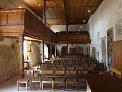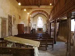 Im Inneren des Langhauses ist eine flache Holzdecke eingezogen, der durch einen weiten Triumphbogen erschlossene Chor weist ein hölzernes Tonnengewölbe auf. An der West- und Südwand des Langhauses läuft eine hölzerne einstöckige Empore um.
