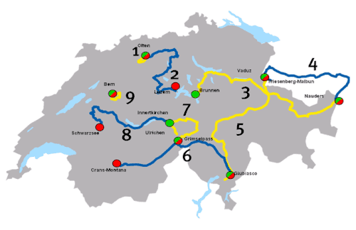 | 6. Etappe | 21. Juni | Giubiasco – Crans-Montana | 190,5* | ||