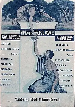 - ↑ Statut Kasy Przezorności i Pomocy Pracowników Fizycznych Towarzystwa Przemysłu Chemiczno-Farmaceutycznego d. Magister Klawe, S.A. Warszawa (Statuten der Arbeiterhilfskasse des Unternehmens)