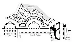 Da sich auf dem Sattel des Quirinal eine Vielzahl kleiner Ladengeschäfte befand, die durch das Abtragen zerstört bzw. umgesiedelt werden mussten, befand sich im unteren Bau eine Vielzahl von Tabernae.[3] Insgesamt besteht der Bau aus über 170 einzelnen Bauteilen, die als große Gruppen zusammengefasst werden können.[4]