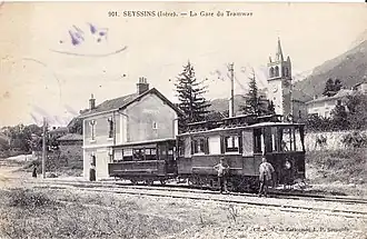 1909 übernahm das Département Isère die Finanzierung des Baus des ersten Teilstücks sowie der dazugehörenden Bahnhöfe. Am 3. November 1909 erfolgte der erste Spatenstich für die Strecke bis Seyssins. Regionale Unternehmen wurden mit der Elektrik der Straßenbahn und dem Design der Triebwagen beauftragt, welche in beide Richtungen fahren mussten. Der Schotter für das Gleisbett stammte aus mehreren lokalen Steinbrüchen.[4] Nach einer Einweihungsfeier am 27. April 1911 (oder 23. April[1]) ging das erste Teilstück am 1. Mai in den regulären Betrieb. Das Teilstück Grenoble–Seyssins war 7,8 km lang und hatte 18 Haltestellen mit einem Bahnhof in Seyssinet-Pariset und Seyssins. Drei Züge fuhren auf der Strecke.[1] Die gesamte Fahrzeit bis Seyssins betrug etwa 30 Minuten.[4][2] Die neue Strecke war sofort ein großer Erfolg, und die Betreiberfirma, die „Société grenobloise de tramways électriques“ (SGTE), befuhr die Linie neunmal täglich.