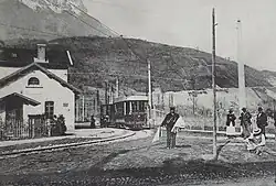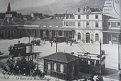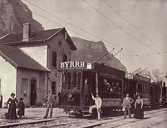 ![]() im Bahnhof Crolles, 1901 Zwei Triebwagen und ein Gepäckwagen mit 1.-Klasse-Abteil des T.G.C. im Bahnhof Crolles, 1901 | |