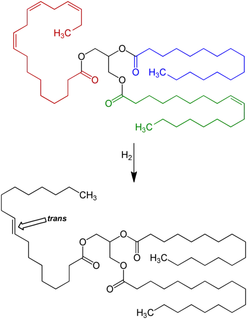 In naturbelassenen Pflanzenölen liegen die ungesättigten Fettsäureester weitgehend in der gewinkelten cis-Form vor. Bei industriellen Prozessen wie der Fetthärtung, d. h. der Umwandlung ungesättigter Doppelbindungen in gesättigte Einfachbindungen durch katalytische Wasserstoffanlagerung, entstehen trans-Fettsäureester als Nebenprodukte (z. B. Elaidinsäure):