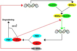 Das TTFL-Modell der Säugetiere enthält viele Komponenten, die Homologen derjenigen sind, die in Drosophila gefunden wurden. Der TTFL der Säugetiere arbeitet so, dass BMAL1 mit CLOCK ein Heterodimer bildet, um die Transkription von mPer und cryptochrom (cry) zu initiieren. Es gibt drei Paraloge oder historisch ähnliche Gene, die heutzutage als Duplikation des period-Gens in Säugetieren auftreten, die als mPer1, mPer2 und mPer3 aufgeführt sind. Es gibt auch zwei Paraloge von Cryptochrom bei Säugetieren. PER- und CRY-Proteine bilden ein Heterodimer und die Phosphorylierung von PER durch CK1δ (Casein kinase I isoform delta) und CK1ε (Casein kinase 1 isoform epsilon) reguliert die Lokalisierung des Dimers zum Zellkern. Im Zellkern reguliert PER-CRY die Transkription ihrer verwandten Gene negativ, indem es BMAL1-CLOCK bindet und sie vom E-Box-Promotor freisetzt.[7]