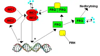Zwei positive Regulatorproteine, Wc-1 (white collar 1 protein) und Wc-2 (white collar 2 protein), binden den frq-Promotor, der als Clock Box bezeichnet wird, während der späten subjektiven Nacht, um die Transkription zu aktivieren. Licht ist auch wichtig, um die FRQ-Expression zu induzieren. WC-1 ist ein Photopigment und Licht ermöglicht WC-1 und WC-2, dass sie sich an einen anderen Promotor binden können, der als proximales Lichtreaktionselement (PLRE) bezeichnet wird. Das FRQ-Protein reguliert die Aktivität von WC-1 und WC-2 negativ. Mehrere Kinasen (CK1-, CK2- und Checkpoint kinase 2-like) und Phosphatasen (PP1 und PP2A) regulieren die Fähigkeit von FRQ, sich in den Zellkern zu verlagern, sowie die Stabilität von FRQ, WC-1 und WC-2.[8]
