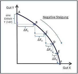 Die Steigung der Produktionsmöglichkeitenkurve, auch als Grenzrate der Transformation bezeichnet, weist typischerweise eine negative Steigung, also einen von links oben nach rechts unten fallenden Verlauf auf (siehe Abb. 3a). Die Opportunitätskosten – der unvermeidbare Verzicht auf eine bestimmte Menge des einen Gutes beim Produzieren einer zusätzlichen Mengeneinheit des anderen Gutes – erklären die fallende Steigung der Kurve. Das bedeutet, zwischen den in der Abbildung 3 dargestellten Gütern X und Y besteht eine inverse Beziehung, man könnte dies auch als einen „Trade-off“ zwischen den Gütern bezeichnen.[13] Mathematisch betrachtet entspricht die Grenzrate der Transformation dem Transformationsverhältnis, folglich dem Verhältnis der beiden Produktmengenänderungen von Gut X und Gut Y unter Verwendung deren Differentiale und .[14] Als Formel betrachtet ergibt sich: