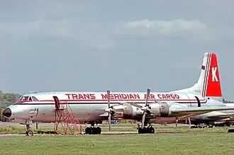 Bei dem Flugzeug handelte es sich um eine Canadair CL-44D4-2 mit der Werknummer 21. Die Maschine absolvierte am 17. Mai 1961 mit dem Testkennzeichen CF-NNE-X ihren Erstflug, ehe sie am 4. Juli 1961 an die Flying Tiger Line ausgeliefert wurde, welche die CL-44 mit dem Luftfahrzeugkennzeichen N452T in Betrieb nahm. Am 20. September 1966 wurde ein Leasingvertrag mit der Transglobe Airways abgeschlossen und die Maschine mit dem neuen Kennzeichen G-ATZH zugelassen, jedoch wurde sie nie übernommen und so wurde der Leasingvertrag bald darauf aufgekündigt. Am 4. Mai 1967 wurde die Maschine wieder mit ihrem vormaligen Kennzeichen N452T auf die Flying Tiger Line registriert und bis zu einer vorläufigen Außerbetriebsetzung und Einlagerung ab dem Jahr 1970 weiterbetrieben. Am 29. Januar 1972 wurde die Maschine an die Transmeridian Air Cargo verkauft und absolvierte einen Überführungsflug vom Los Angeles International Airport zum London Stansted Airport und dann weiter zum London Southend Airport. Am 7. März 1972 sollte die Maschine mit dem bereits 1966 aufgetragenen Kennzeichen G-ATZH wieder zugelassen werden, jedoch wurde das Kennzeichen zunächst als G-ATHZ aufgetragen, was später korrigiert werden musste. Am 13. März wurde die Maschine wieder zum London Stansted Airport geflogen und dort eingelagert. Am 1. August 1972 wurde die Maschine für Filmarbeiten mit einer Bemalung der Royal Air Force, dem militärischen Luftfahrzeugkennzeichen XV196 sowie der Beschriftung Royal Air Force Air Support Command versehen. Nach Abschluss der Filmarbeiten stand die Maschine einige Zeit abgestellt und wurde als Teileträger verwendet. Ab dem 1. Februar 1974 wurde sie überholt und für einen Weiterbetrieb vorbereitet. Am 8. August 1975 erhielt die Maschine ein neues Lufttüchtigkeitszeugnis und ging einen Tag darauf wieder mit dem Kennzeichen G-ATZH in Betrieb. Das viermotorige Langstrecken-Frachtflugzeug war mit einem abklappbaren Heckteil (Swing Tail) sowie vier Turboproptriebwerken des Typs Rolls-Royce Tyne 515-12 ausgerüstet. Bis zum Zeitpunkt des Unfalls hatte die Maschine eine Gesamtbetriebsleistung von 29.376 Betriebsstunden absolviert, davon 69 Betriebsstunden seit der letzten turnusmäßigen Wartungsinspektion.