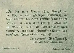 Mit dem Aufkommen von Zeitungen etablierte sich die zunächst in sehr schlichter Form aufgemachte Kleinanzeige, die im Lauf der Zeit eine Wandlung bis zur relativ fest etablierten Form der Gegenwart erfuhr. Die erste Todesanzeige lässt sich 1753 in Ulm nachweisen.[2] Im 19. Jahrhundert machten eigenständige Zeitungsrubriken unter dem Titel „Verstorbene“ die aktuelle Totenliste bekannt. Solche reinen Listen, die meist nur den Namen und die Lebensdaten (oft in Verbindung mit der letzten Wohnadresse) der verstorbenen Person nennen, sind als amtliche Veröffentlichungen der Standesämter in manchen Städten und Gemeinden noch heute üblich, aufgrund des Datenschutzes wird es jedoch vielerorts aufgegeben oder nur noch praktiziert, wenn die Angehörigen zustimmen.