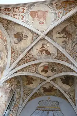 Die Kapelle besitzt eine lebhafte Bemalung. Im Gewölbe der Kapelle sind, in Medaillons eingefügt und umrankt von Grotesken, im ersten Joch die Kirchenväter und im zweiten Joch die Evangelisten mit ihren Attributen dargestellt.[1] Das große Fresko links vom Eingang stellt die Auferstehung der Toten zum Jüngsten Gericht dar, daneben sind der Sündenfall im Paradies (Epitaph an der Stirnwand, Mitte) sowie die Heilserwartung des Alten wie des Neuen Bundes (Epitaph an der Stirnwand, Seitenbilder) zu sehen.