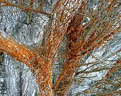 Trentepohlia sp. auf der Rinde der japanischen Sicheltanne