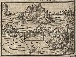 Vermessung eines Geländes mittels der Linien eines Dreiecks (Holzschnitt, 1667)