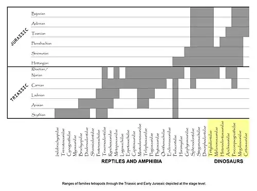 - Heterodontosauridae und Scelidosauridae (Dinosaurier der Ordnung Ornithischia)
