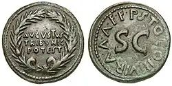 Im Zuge der Gründung des Prinzipats durch den ersten römischen Kaiser Augustus kam es zu einer Trennung von Amt und Amtsgewalt des Volkstribunen. Zeitpunkt und Umstände der Verleihung der tribunicia potestas an Augustus sind aufgrund der Quellenlage[7] unklar und umstritten. 36 v. Chr. erhielt er wesentliche Elemente tribunizischer Gewalt, so die sacrosanctitas, das ius subselli und das ius auxilii. 30 v. Chr. wurde letzteres über das Stadtgebiet Roms bis zum ersten Meilenstein ausgeweitet. Ab 23 v. Chr. konnte der princeps über die volle tribunicia potestas annua et perpetua verfügen und damit im gesamten Reichsgebiet des römischen Imperiums ständig ausüben. Seitdem war die Amtsgewalt der Tribunen Bestandteil der kaiserlichen Macht, was sich auch an der Zählung der Kaiserjahre nach der tribunicia potestas zeigte. Das Amt selber, die damit verbundenen Pflichten und den Titel übernahm der Patrizier Augustus nicht, desgleichen seine Nachfolger.[8] Der princeps genoss mithin die umfassenden Rechte des Volkstribuns, ohne auch den Beschränkungen des Amtes unterworfen zu sein.