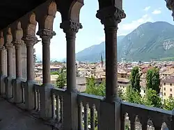 - Berg Doss Trento mit Resten einer frühchristlichen Basilika und weithin sichtbarem Mausoleum des Cesare Battisti (1935)