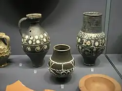 Die aufgemalten Inschriften geben Einblick in die Tischsitten des 3. und 4. Jahrhunderts n. Chr. Viele vorhandene Inschriften sind bis zu dessen Erscheinen zusammengefasst im Corpus Inscriptionum Latinarum Band XIII.[11] Meist geben sie alltägliche Dialoge zwischen dem Wirt und seinem Gast, Zecher und Freundin sowie dem Gefäß und dem Trinker wieder. Die weitaus größte Gruppe enthält Zurufe oder Aufforderungen zum Weintrinken. Die Schrift bestand üblicherweise aus Weißbarbotine-Punkten oder sie wurde aufgemalt. Durch ihr Dekor oder ihre Inschriften sind außerdem einige Gefäße als Votivgabe identifizierbar. Sie geben Aufschluss über das religiöse Gedankengut dieser Zeit. Besonders zahlreich sind dabei die Bezüge zum Mithraskult.