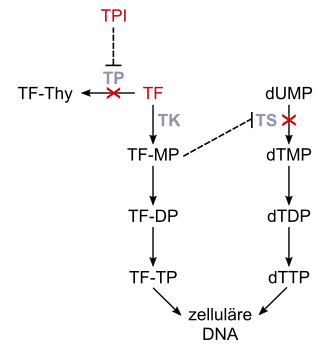 Die TS-Hemmung kann nur aufrechterhalten werden, wenn wie bei einer Dauerinfusion, TF kontinuierlich nachgeliefert würde. Ansonsten erholt sich die TS schnell und der zytotoxische Effekt ist beendet. TF wird bei der Resorption aus dem Darm, in der Leber, der Milz und auch intrazellulär recht schnell durch das Enzym Thymidinphosphorylase (TP) inaktiviert.[17]