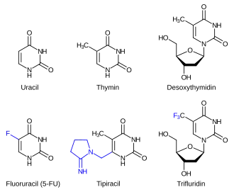 Fluorouracil (5-FU) ist ein Antimetabolit aus der Gruppe der Pyrimidinanaloga und ähnelt dem Uracil (s. Abb.) Auch 5-FU ist nicht aktiv, sondern muss in die entsprechenden Ribo- und Desoxyribonukleoside (5-Fluorouridin, 5-Fluorodesoxyuridin) verstoffwechselt werden. Der Metabolit 5-FdUMP hemmt die Thymidilat-Synthase, wodurch die Umwandlung von Desoxyuridinmonophosphat (dUMP) zu Desoxythymidinmonophosphat (dTMP) blockiert und in der Folge die DNA-Synthese inhibiert wird. Mit Trifluridin liegt bereits das dem Thymidin ähnelnde Desoxynukleosid vor. Hier wurde die Methylgruppe durch Trifluorierung ersetzt, die das Enzym durch Bindung an das katalytische Zentrum hemmt. In präklinischen Studien wurden für Trifluridin/Tipiracil sowohl gegen 5-Fluorouracil (5-FU)-sensitive als auch gegen resistente kolorektale Tumorzelllinien getestet. Hierbei korrelierte die zytotoxische Aktivität von Trifluridin/Tipiracil in unterschiedlichen humanen Tumor-Xenotransplantaten stark mit der in die DNS eingebauten Menge von Trifluridin, was den DNA-Einbau als primären Wirkmechanismus nahelegt. Der antitumorale Effekt von TF wird somit prädominant durch den Falscheinbau in DNS bewirkt und weniger durch die TS-Hemmung.[20]