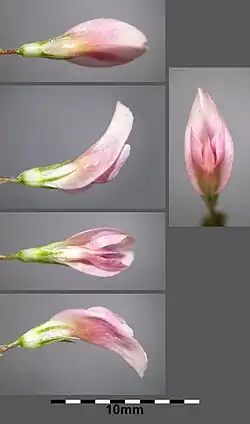 Die zwittrigen Blüten sind zygomorph und fünfzählig mit doppelter Blütenhülle. Die fünf Kelchblätter sind röhrig verwachsen. Der Kelch ist bis zu 4 Millimeter lang, er ist fast kahl und wird während der Seneszenz ganz kahl. Die weiße Kelchröhre ist häutchenartig mit fünf deutlichen und fünf unauffälligen Rippen. Die Kelchzähne sind ungleich und ein bis zweimal länger als die Kelchröhre. Die grün-roten Kelchzähne sind lanzettlich oder pfriemförmig, mit breiten Einschnitten zwischen ihnen. Die Krone ist 0,7 bis 1 Zentimeter hoch und besitzt die typische Form der Schmetterlingsblüte. Die beim Aufblühen weißen, später rosa oder fleischfarbenen Kronblätter sind länglich eiförmig und in der oberen Hälfte fein gezähnelt. Von den zehn Staubblättern sind neun miteinander verwachsen. Das einzelne grüne, oberständige Fruchtblatt ist etwa 2,2 Millimeter lang und enthält ein bis zwölf Samenanlagen. Der Griffel ist etwa 2,5 Millimeter lang.
