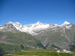 | Blick vom Zinalrothorn: Das Trifthorn ist der kleine, schneebedeckte Gipfel in der unteren Hälfte des Bildes. | ||