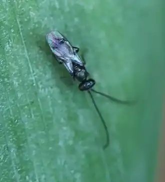 Die Männchen sind deutlich kleiner als die Weibchen. Ihre Körperlänge liegt bei etwa 3 mm. Sie besitzen einen metallischen dunkelblaugrünen bis schwarzen Körper. Dieser ist ebenfalls wie bei den Weibchen mit kurzen feinen weißen Härchen bedeckt. Der Hinterleib ist annähernd tonnenförmig und schlank. Die Vorderflügel weisen einen dunklen Fleck auf, der vom Stigma nicht ganz bis zur Flügelmitte reicht.[1]