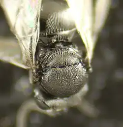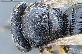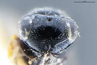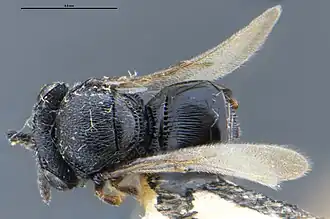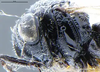 Die Weibchen sind 0,99–1,33 mm lang, die Männchen 0,94–1,20 mm.[2] Die Weibchen besitzen am Hinterleibsende einen kurzen Ovipositor (Legebohrer). Kopf, Mesosoma und Metasoma sind schwarz. Die Beine besitzen folgende Färbung: Die Coxae sind braun bis schwarz gefärbt. Die Femora und Tibien sind dunkelbraun mit gelben apikalen Enden. Die Trochanteren und Tarsen sind gelb bis blass braun gefärbt. Der anteroventrale Bereich der hinteren Femora ist mit Borsten (Setae) besetzt.[1] Weitere morphologische Eigenschaften wie die Körperproportionen und die Oberflächenbeschaffenheit werden zur Abgrenzung von den sehr ähnlichen verwandten Arten herangezogen.[1][2] Zur Artbestimmung bzw. Artunterscheidung wird weiterhin auf Molekularuntersuchungen zurückgegriffen.