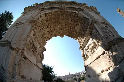 - ↑ Marie-Thérèse Champagne: Pagan Rome in the Service of the Church: Christian Perceptions of the Arch of Titus in the Middle Ages, Leiden/Boston 2021, S. 67: “The movement of a pope, his clerical entourage, and lay participants through … the Forum Arch, reinforced the concept that Christianity was the fulfillment of Judaism and the correction of Rome’s pagan past”.