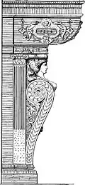 Der unterste Teil besteht aus zwei Füssen – „durch weibliche Hermen gebildet, die auf dem lockengeschmückten Haupt ein jonisches Kapitäl und darüber die reichverzierte Konsole tragen, links die Zahl 1578, rechts die Buchstaben DNW “.[1]