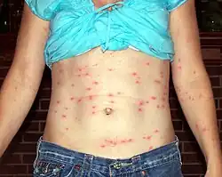 Die Trombidiose oder Trombikulose ist eine parasitäre Hautkrankheit durch den Befall mit Larven der Laufmilben (Familie Trombiculidae). Sie tritt beim Menschen bevorzugt im Spätsommer und Herbst auf und wird auch als Bohnenkrätze, Erntekrätze, Erythema autumnale, Gadnerbeiß, Giesinger Beiß, Herbstbeiße, Herbstkrätze, Heukrätze oder Sendlinger Beiß bezeichnet.[1] Prinzipiell können aber alle landlebenden Wirbeltiere von Laufmilbenlarven befallen werden. In Europa ist der häufigste Auslöser die Herbstmilbe. Die Larven zerschneiden mit ihren Mundwerkzeugen die Epidermis und lösen mit ihrem Speichel das Gewebe in der Tiefe auf. Dabei entsteht eine Ernährungsröhre über die sie die Gewebsflüssigkeit aufnehmen. Die weitere Entwicklung der Laufmilben findet außerhalb von Wirbeltieren statt. Durch den Saugakt der Larven entstehen Papeln oder rote Flecken mit einem zentralen Flüssigkeitsbläschen. Es besteht starker Juckreiz. Eine Behandlung ist zumeist nicht notwendig.