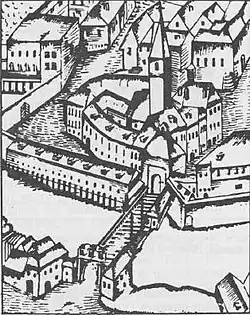 1657 durch einen Brand zerstört und durch eine neue, ebenfalls aus Holz gefertigte, „Neue Brücke“ ersetzt. An den Seiten wurden Verkaufsbuden aufgestellt, in der Mitte der Brücke befand sich ein Kruzifix. 1796 wurde das Kreuz entfernt und befindet sich heute oben auf der Treppe vor dem Eingang zur Franziskanerkirche.