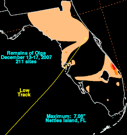 Während sich Olga noch in der westlichen Karibik befand, setzten entlang eines Trogs in seinem nordöstlichen Quadrantenam 14. Dezember Regenfälle ein. Diese summierten sich auf 180 mm in Nettles Island, Florida. Das Resttief intensivierte sich aufgrund gelegentlicher Konvektion in der Nähe und östlich des Zentrums, als sich das System Florida näherte. Clearwater Beach meldete am 16. Dezember zwischen vier und fünf Uhr morgens Ortszeit einen Luftdruck von 1002 hPa und andauernde Winde von 70 km/h, mit Böen von 125 km/h. Als sich eine Kaltfront näherte, litt das System und löste sich auf, bevor es die Küste Floridas erreichte.[1]
