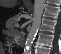 - Diagnostik: früher erfolgte zur Sicherung der Diagnose eine Angiographie, welche heute durch eine CT-Angiographie oder MRT-Angiographie ersetzt wurde, wobei die CT-Untersuchung wegen der besseren Darstellung der benachbarten Bauchorgane bevorzugt wird.[4]