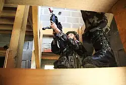 - Das „Shoot House“ ist ein Objekt, das für Häuserkampf-Simulationen auf urbanen Schauplätzen errichtet wurde. Es besteht aus Holzbalken, welche Gebäude darstellen. Dieses Objekt ist oben offen und wurde mit Kameras ausgestattet. Dies ermöglicht die Beobachtung der Übungssituation aus der Vogelperspektive bzw. von einem Kontrollraum aus.