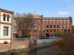 Das Fabrikgebäude ist ein an der Längsseite 21-achsiger Bau in Nord-Süd-Ausrichtung.[4] Das viergeschossige Gebäude aus Ziegelmauerwerk hat rundbogige Fenster und eine aufwändige Gliederung mit einem vierachsigen Mittelrisalit und Eckrisaliten mit Zinnenkränzen und flankierenden Türmchen. Über dem Mittelrisalit befindet sich ein Walmdach, der Rest des Gebäudes ist mit Satteldächern überdacht. Unter dem ersten und dem obersten Geschoss ist die Fassade horizontal durch Sohlbankgesimse gegliedert. Die Fenster der ersten drei Geschosse sind segmentbogig, die des obersten Geschosses korbbogig abgeschlossen. Der Dachbereich wurde nachträglich ausgebaut und mit einem Fensterband versehen. Die Fenster der Obergeschosse im Mittelrisalit sind gekoppelt und durch Rundbögen zusammengefasst. Im abschließenden Zinnenkranz befand sich bis zur Sanierung in den 1990er Jahren die Inschrift „GEGR. 1841“, die danach entfernt wurde. Die Eckrisaliten haben in den Obergeschossen Rundfenster, in diesen Risaliten befinden sich die Treppenhäuser.