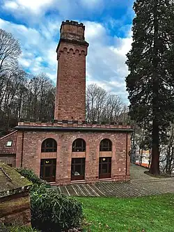Das historische Tunnelbelüftungsgebäude am Königstuhl erhebt sich inmitten des Heidelberger Stadtwalds, am Johannes-Hoops-Weg 8. Das an eine spätmittelalterliche Festung erinnernde technische Gebäude mit seiner außergewöhnlichen Turmarchitektur wurde als obertägiges Maschinenhaus im Rahmen der Erbauung des Königstuhltunnels (1909/1912) im Jahr 1914 in Betrieb genommen. Anfänglich lief durch den Tunnel nur Güterverkehr.[1] Der Personenverkehr erfolgte über die benachbarte Odenwaldbahn.