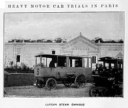 Die Produktion von Nutzfahrzeugen fast gleichzeitig mit der Automobilherstellung aufgenommen; sie bekam sehr bald eine größere Bedeutung als die Automobilherstellung. 1900 wurde ein Dampf-Doppeldeckerbus vorgestellt, und im Oktober des gleichen Jahres nahm ein kleinerer Turgan-Dampfomnibus an einem Wettbewerb für Nutzfahrzeuge in Paris teil.[8] 1905 bestand das Programm aus je einem Dampf-Lastkraftwagen mit 3 respektive 6 long tons Nutzlast. Diese Fahrzeuge hatten einen mit Kohle befeuerten Heizkessel im Bug und je eine Verbunddampfmaschine für jedes Hinterrad; letztere waren unter dem Fahrersitz angebracht und übertrugen die Kraft mittels langer Ketten. Ab 1905 verfügten Lastkraftwagen und Omnibusse wahlweise über Benzin- oder Dampfmotoren[1], als ein Nutzfahrzeug-Fahrgestell mit einem 24 PS Vierzylindermotor für beide Anwendungen aufgenommen wurde.[9] Ein Lastwagen hat an der Prüfungsfahrt von 1905 teilgenommen. Dieses Fahrzeug war mit einem Vierzylindermotor mit 4942 cm³ Hubraum mit 110 mm Bohrung und 130 mm Hub ausgestattet. Die Motorleistung lag bei 22 PS bei 800/min. Die Geschwindigkeit wurde über ein Pedal auf folgende Geschwindigkeiten geregelt: 2 km/h, 6 km/h, 10 km/h oder 14 km/h. Der Radstand betrug 3800 mm und die Spurweite 1500 mm. Das Leergewicht betrug 3200 kg und die Zuladung 2406 kg, somit 5606 kg zulässiges Gesamtgewicht. Die Antriebskraft wurde über Ketten an die Hinterachse übertragen. Die Bereifung vorn hatte einen Durchmesser von 900 mm und hinten von 1000 mm.[10] Mindestens ein Turgan-Doppeldeckerbus wurde hergestellt. Er wurde in London im Liniendienst eingesetzt. Ein Vierzylindermotor hatte 6785 cm³ Hubraum mit 120 mm Bohrung und 150 mm Hub. Der Motor leistete 40 bis 50 PS.[11] Als letztes Modell erschien 1907 ein Frontlenker mit 20 PS Vierzylindermotor und Doppelketten zur Hinterachse.[9]