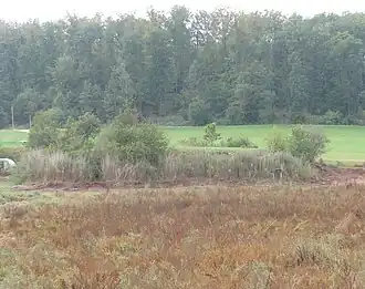 ![]() Schilfumwachsener Turmhügel am Südufer des trockengelegten Karrachsees (Bildmitte) | ||
