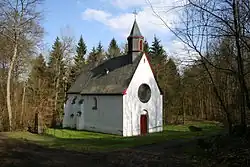 ![]() Rekonstruktionsversuch von Kapelle und Turmhügelburg für die Zeit um das Jahr 1300 (Kapelle noch ohne Chorraum) | |