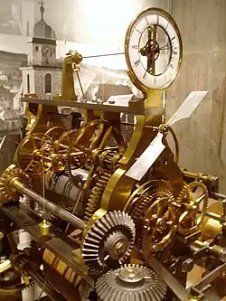 Die im Bildvordergrund sichtbaren großen stählernen Kegelräder dienen zum Aufziehen des im Turm aufgestellten Werks von einer tiefer gelegenen Etage aus. Eine solche Aufzugseinrichtung ist für jedes der vier Werke vorhanden. Damit die Uhr während des Aufziehens nicht stehen bleibt, hat Collin an den Walzenrädern weitere Differenzialgetriebe angebracht.
