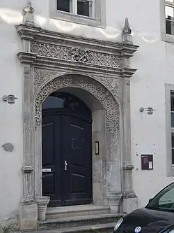 Das Portal wird in die erste Hälfte des 17. Jahrhunderts datiert. Es ist in Pilasterstellung, Gebälk und Obeliskaufsätze gegliedert. Zudem wurde es mit zwei Sitznischen versehen. Das Wappen und die flächige ornamentale Ausschmückung stammen vom Ende des 19. Jahrhunderts.
