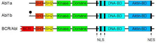 c-Abl ist ein Protein mit einer Molekülmasse von etwa 145 kDa, das durch ein Gen auf dem Chromosom 9 Genlocus q34 codiert wird. Es besteht aus jeweils einer SH2- und SH3-Domäne, die für die Regulierung von c-Abl verantwortlich sind, und einer die Enzymfunktion tragenden Kinasedomäne. Der C-Terminus trägt Bindungsdomänen für eine Interaktion mit der DNA und mit Aktin. Durch unterschiedliches Splicing können zwei verschiedene N-terminale Proteinsequenzen gebildet werden. Der N-Terminus von c-Abl, der im Falle der Splicevariante 1B zusätzlich eine Myristylierungsstelle trägt, ist für die Autoinhibition verantwortlich. Eine Bindungsstelle für Myristinsäurereste konnte im C-Lobe der Kinasefunktion identifiziert werden.[1]