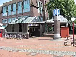 Die U-Bahn-Station befindet sich unter der Einkaufsstraße Tibarg, die mit dem Bau der Station zur Fußgängerzone umgebaut wurde. An beiden Enden des Mittelbahnsteigs befinden sich Zugänge, der zum Busbahnhof führende südwestliche Zugang verfügt über ein Zwischengeschoss mit Fahrkartenautomaten und einem Zeitungskiosk. Ein Fahrstuhl, der ebenso wie der nordöstliche Zugang direkt Straßenoberfläche und Bahnsteig verbindet, sorgt für Barrierefreiheit.[5]