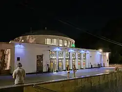 Letztendlich wurde das Empfangsgebäude als Pavillon mit einer zentralen Kuppel aus Stahlbeton ausgestaltet. Der Baukörper mit flacher Kuppel und Sockel verweist auf die Planungsgeschichte in den 1950er Jahren[3]. Er nimmt den Kassenbereich und den Zugang zur Rolltreppenanlage auf. Links und rechts schließen sich die Kolonnaden des ehemaligen Haupteingangs des Botanischen Gartens der Kiewer Universität an. Aufgrund der Topographie des Geländes liegt ein Teil der Rolltreppenanlage außerhalb des Empfangsgebäudes über der Erdoberfläche. Dies wird durch eine Terrasse mit zwei geschwungenen Treppen aus Granit jedoch kaschiert. Auf Schmuckelemente weitgehend äußerlich weitgehend verzichtet, lediglich einige Gesimse zieren die Fassade, ansonsten ist diese großflächig glatt verputzt[3]. Das M als Zeichen für die Metro ist jedoch mit floralen Motiven verziert. Auf der zum Botanischen Garten gewandten Seite des Pavillons befand sich ursprünglich ein Café.