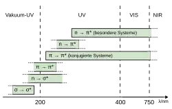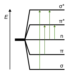 Bei der UV/VIS-Spektroskopie handelt es sich um eine Elektronenspektroskopie, das heißt, es werden Elektronen angeregt, genauer Valenzelektronen. Die Elektronenübergänge, die dabei auftreten können, lassen sich mit Hilfe der beteiligten Molekülorbitale bestimmen. Nach dem MO-Schema spalten sich die Orbitale bei Überlappung in besetzte bindende (σ, π) und nicht bindende Orbitale (n), sowie in nichtbesetzte antibindende Orbitale (π*, σ*) auf. In der Regel befinden sich alle Elektronen im bindenden Orbital und das antibindende Orbital bleibt leer. Werden Elektronen angeregt, wechseln sie in das antibindende Orbital. Man unterscheidet daher folgende Elektronenübergänge, die mit σ→σ*, π→π*, n→π* usw. bezeichnet werden. σ-Orbitale liefern eine wesentlich größere Aufspaltung als π-Orbitale, da die Energieaufspaltung zwischen dem bindenden und dem antibindenden Orbital mit dem Grad der Überlappung der Atomorbitale zunimmt.[11]