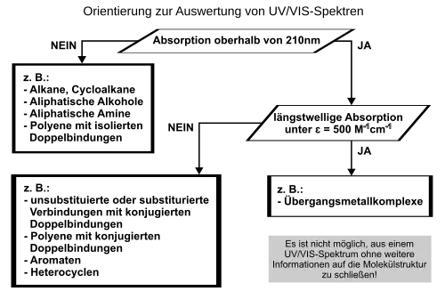 UV/VIS-Spektren dienen dazu, Vermutungen über die Struktur der gesuchten Substanz zu bestätigen oder einzuschränken. Das Spektrum gibt Auskunft über die Art des Chromophors. Aussagen über andere Strukturteile des Moleküls sind nicht möglich. Die Bestimmung von Chromophoren mit Hilfe eines UV/VIS-Spektrums ist deshalb oft schwierig und wird daher in Kombination mit zusätzlichen spektroskopischen Methoden (IR-Spektroskopie, NMR-Spektroskopie) durchgeführt.[6]